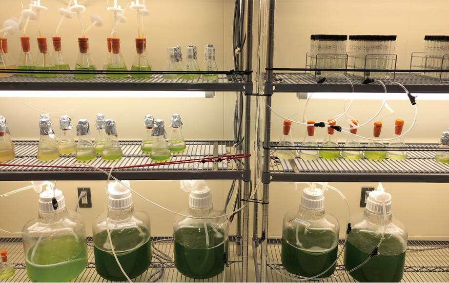 微細藻類は光合成を⾏うので、光をあて、⼆酸化炭素(数%程度)を通気します。